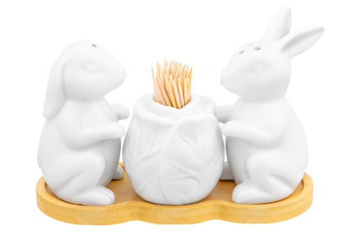 БЫЛО 493 руб! Набор д/специй 3 пр. 14*6*9,5 см "Кролики с капустой" на дер. подставке+зубочистки