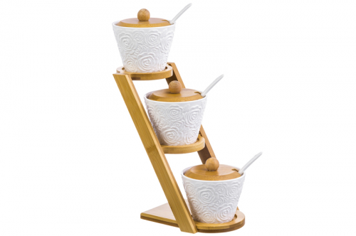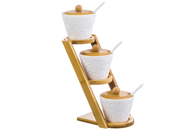 БЫЛО 1249 руб! Набор 3 банок д/хранения 150 мл 13,5*11*30 см "Розы" на дер. подставке (3 этажа) + ложки