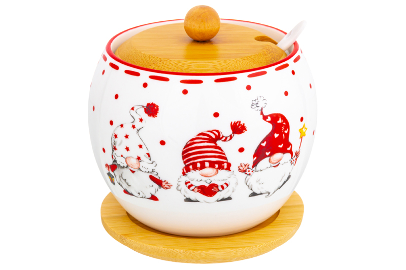 БЫЛО 505 руб! Сахарница 620 мл 12*12*12 см "Весёлые гномики" + ложка + дер. крышка на дерев. подставке