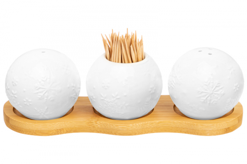 БЫЛО 429 руб! Вазочка под зубочистки + набор для специй 3 пр. 19,5*7*6 см 75 мл "Снежинки" на деревянной подставке