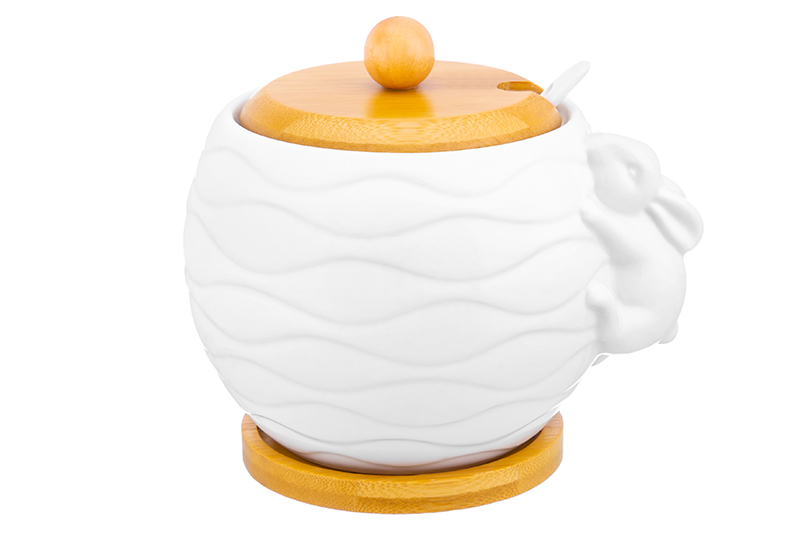 БЫЛО 567 руб!! Сахарница 620 мл 12*12*12 см "Кролик" волны + ложка + дер. крышка на дер. подставке