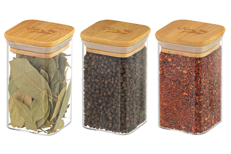 БЫЛО 712 руб! Набор 3 банок д/хранения 250 мл 6*6*11 см "Crystal glass" + бамбук.крышка с силик.проклад, стекло