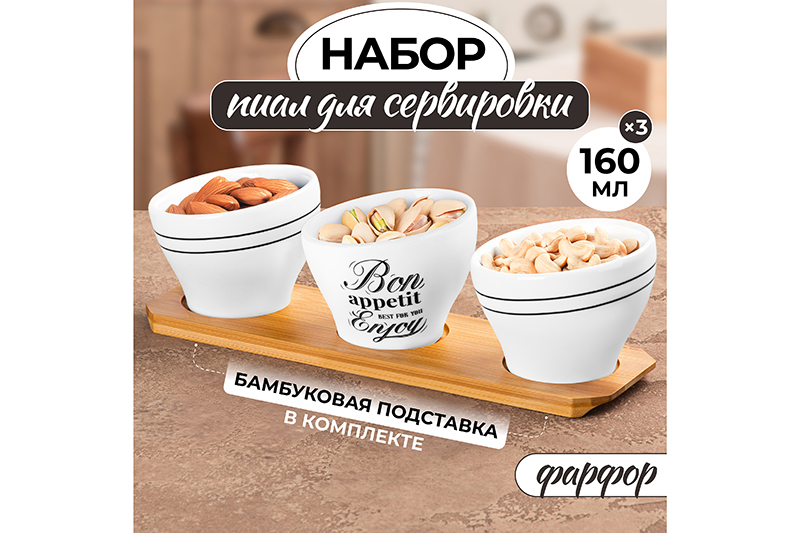 БЫЛО 1099 руб! Набор 3 блюд д/сервировки 160 мл 27,5*8*8 см "Bon Appetit" + бамбуковая подст.