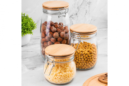 БЫЛО 1218 руб! Набор 3 банок д/хранения 1,5 л+750 мл+500 мл "Glaskraft" + крышки бамб.с металл. зажим. и сил.уплот