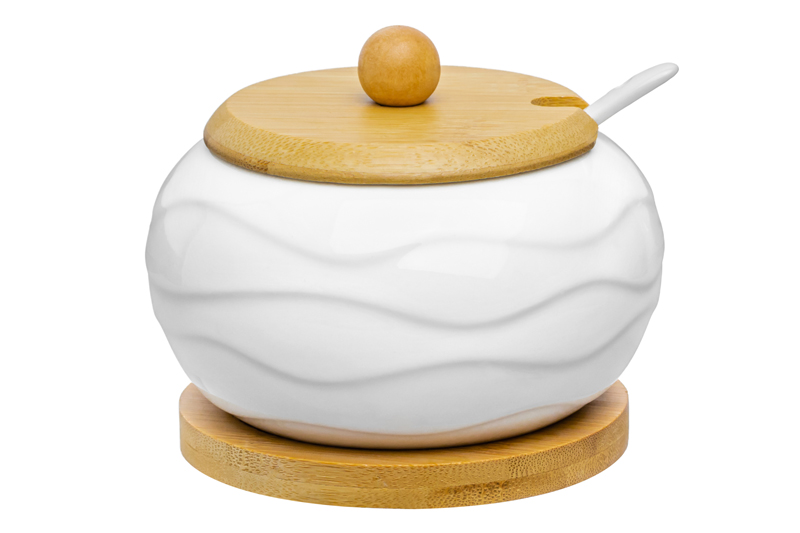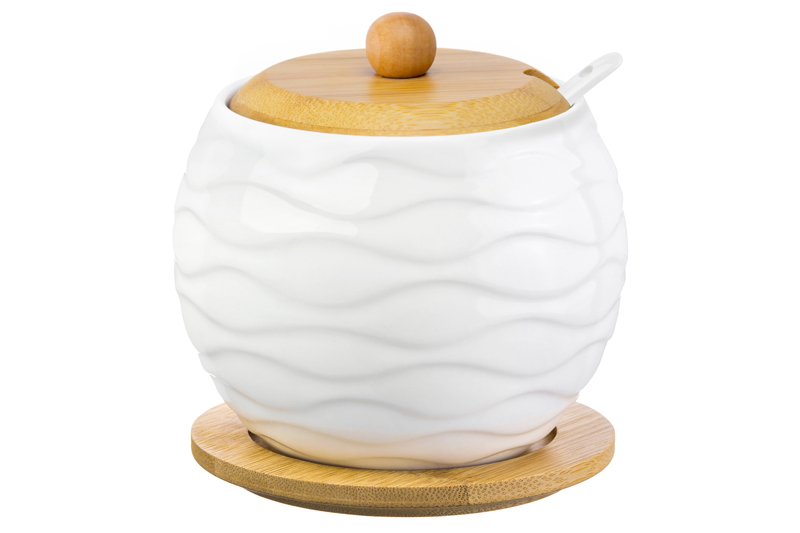 БЫЛО 444 руб!! Сахарница 310 мл 11*11*9,5 см "Айсберг волны" + ложка + дер. крышка на дер. подставке
