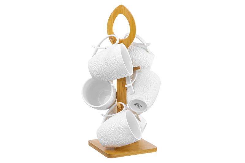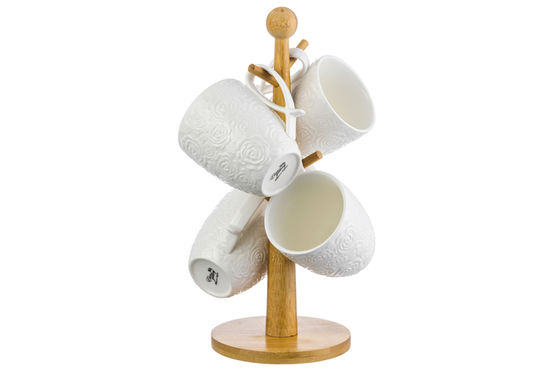 БЫЛО 2081 руб!! Набор 6 кружек 300 мл 16*18*38 см "Розы" на дерев. подставке с ручкой