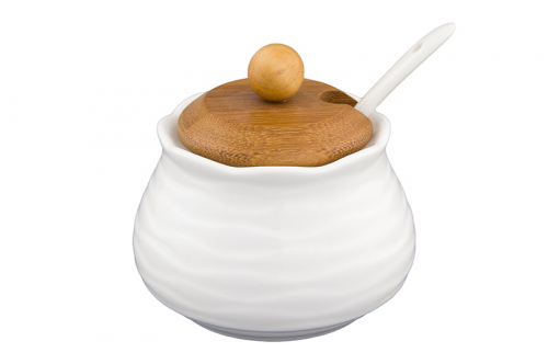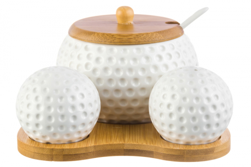 БЫЛО 750 руб!! Набор - сахарница 440 мл 15,5*15,5*9,5 см "Сфера" с ложкой + солонка + перечница на дерев. подставке