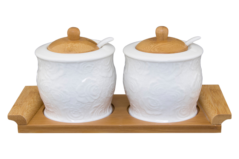 БЫЛО 900 руб!! Набор 2 банок д/хранения 300 мл 24*9,7*10 см "Белые розы" с дер. крышкой на дер. подставке + 2 ложки
