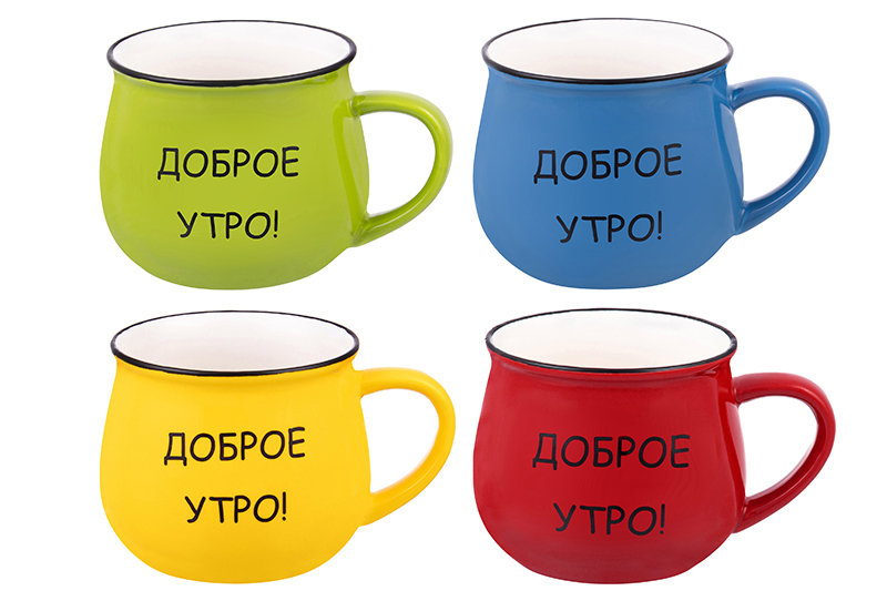 БЫЛО 1217 руб! Набор 4 кружек 400 мл 13*9,5*8 см "Доброе утро!" ярко-салатовая + индиго + ярко-желтая + красная.