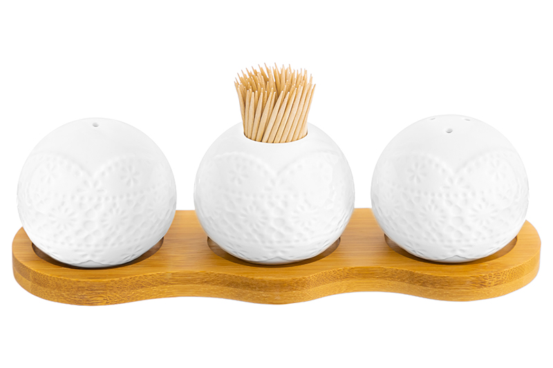 БЫЛО 440 руб! Вазочка под зубочистки + набор для специй 3 пр. 19,5*7*6 см 75 мл "Кружево" на деревянной подставке