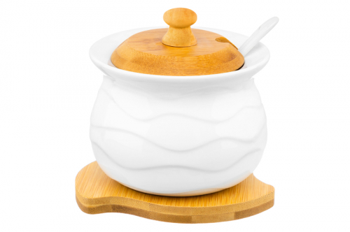 БЫЛО 455 руб! Сахарница 310 мл 11*11*9,5 см "Айсберг волны" + ложка + дер. крышка на дер. подставке