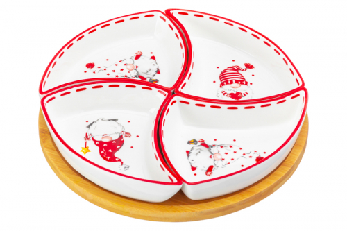 БЫЛО 1312 руб! Менажница 25*25*6 см "Весёлые гномики" крутящ. 4 секции на дерев. подставке