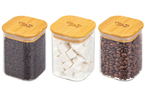 БЫЛО 1048 руб. Набор 3 банок д/хранения 450 мл 8*8*11 см "Crystal glass" + бамбук.крышка с силик. проклад,стекло