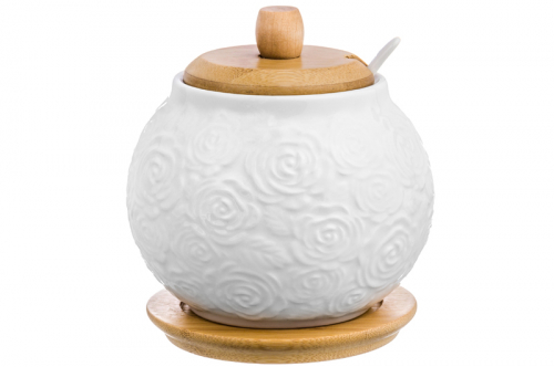 БЫЛО 455 руб. Сахарница 620 мл 11*11*12 см "Розы" + ложка + дер. крышка на дер. подставке