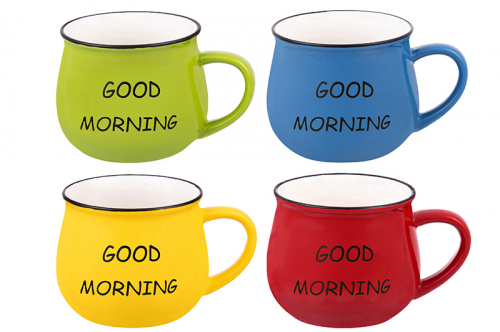 БЫЛО 1217 руб! Набор 4 кружек 400 мл 13*9,5*8 см "GOOD MORNING" ярко-салатовая + индиго + ярко-желтая + красная