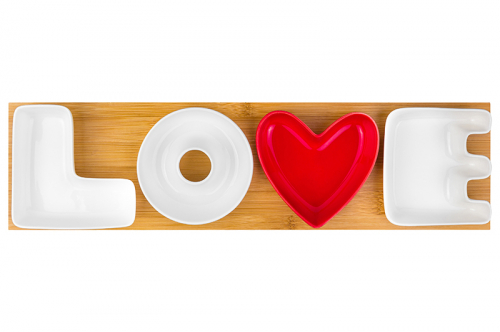 БЫЛО 1232 руб! Набор 4 сервировочных блюд 43*11,5*4 см "LOVE - V КРАСНОЕ" на деревянной подставке