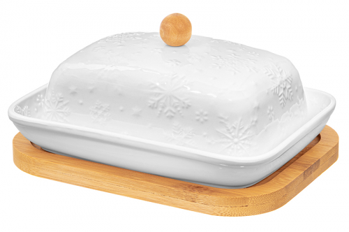 БЫЛО 937 руб! Масленка 16,5*13*8,5 см с крыш. "Снежинки" на дер подставке