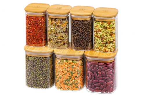 БЫЛО 2100 руб! Набор 7 банок д/хранения 3 пр. 450 мл + 4 пр. 250 мл "Crystal glass" + бамб.крышка с силик.прок.