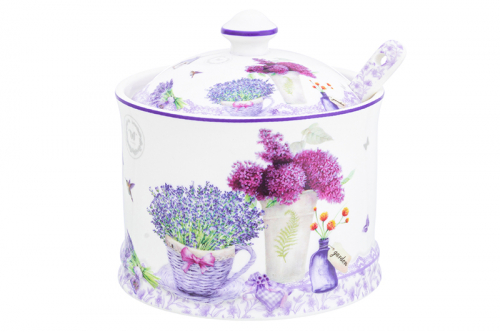 БЫЛО 515 руб! Сахарница 250 мл 9*9*10 см "Лаванда" + ложка, NEW BONE CHINA