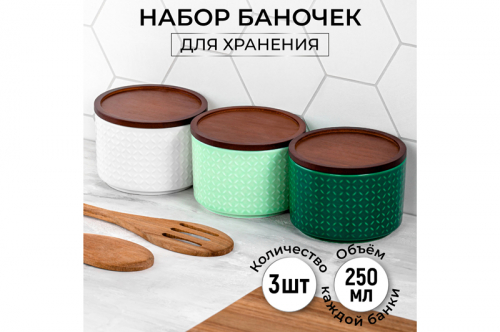 БЫЛО 974 руб! Набор 3 банок д/хранения 250 мл 9,3*9,3*7 см "Орнамент" +дер.крыш-подст. с сил/упл (бел, фист, зел)
