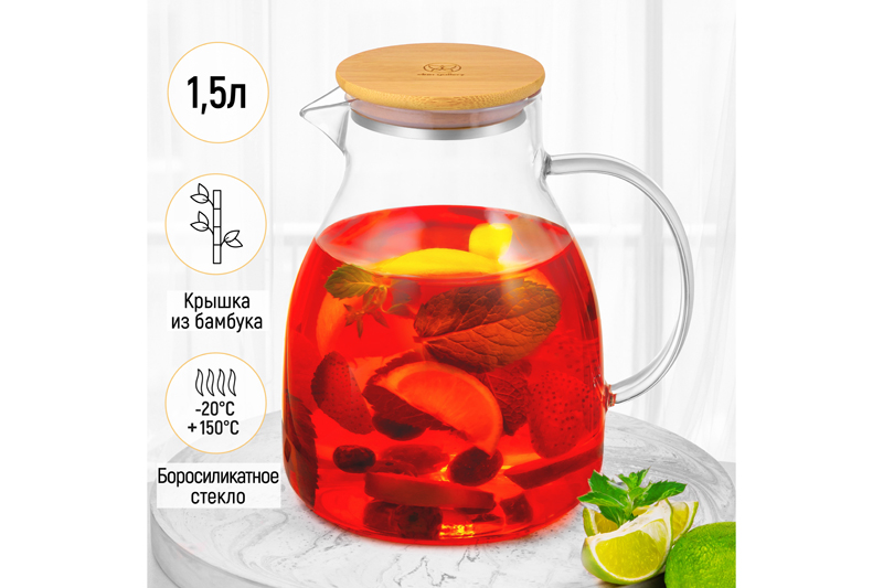 БЫЛО 1242 руб! Кувшин 1,5 л 17,5*13,5*19,3 см "Crystal glass"+ бамбук.крышк имеющая мет.дно и силик.проклад,стекло
