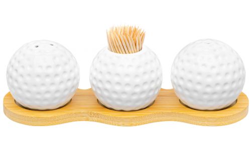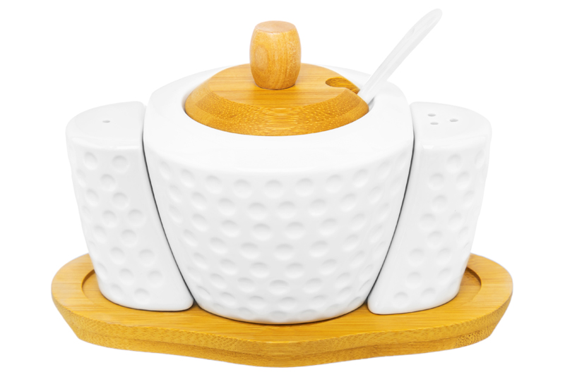 БЫЛО 874 руб! Набор - сахарница 300 мл 16*10*11 см "Сфера" с ложкой + солонка + перечница на дер. подставке