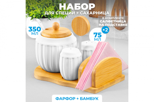 *БЫЛО 1238 руб! Набор - сахарница 350 мл "Ампир" с ложкой + солонка + перечница + салфетница на дер. подст. с ручкой