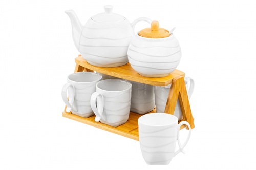 БЫЛО 3617 руб! Набор - чайник + сахарница + 6 кружек "Айсберг волны" на бамбуковой подставке