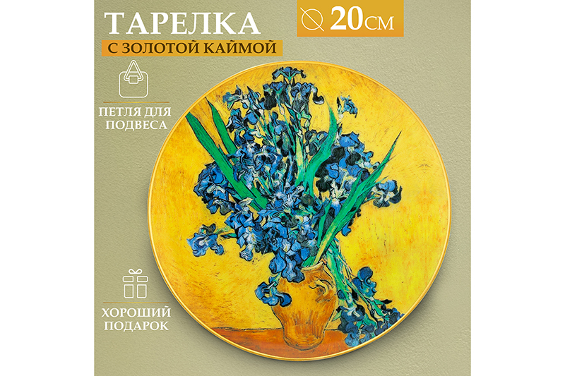 БЫЛО 394 руб! Тарелка декор. 20*20*2 см "Ирисы в вазе" с золотой каймой, круг + крючок + подст.