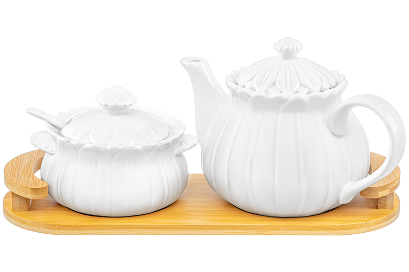 БЫЛО 1451 руб! Набор - чайник 700 мл + сахарница 300 мл "Цветок" с ложкой на дер. подставке с ручками