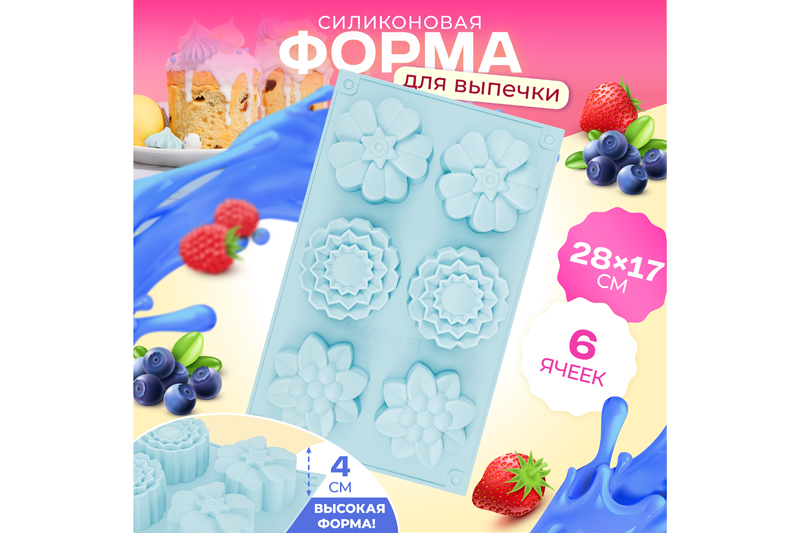 БЫЛО 315 руб! Форма для выпечки 6 ячеек 28,5*17,5*4 см "Цветы" голубая
