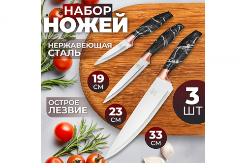 БЫЛО 835 руб! Набор 3 ножей 19,5*2*2,8 см + 23,5*2*2,8 см + 33*2,5*4,6 см "Мрамор" с черной ручкой