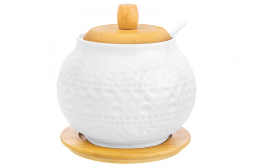 БЫЛО 583 руб! Сахарница 620 мл 11*11*12 см "Белое кружево" + ложка + дер. крышка на дер. подставке