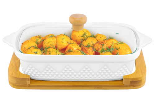 БЫЛО 1305 руб! Блюдо д/зап и серв 30*18*13 см 1,1 л "Ромбики" прямоуг. + стекл крышка, на дер подставке