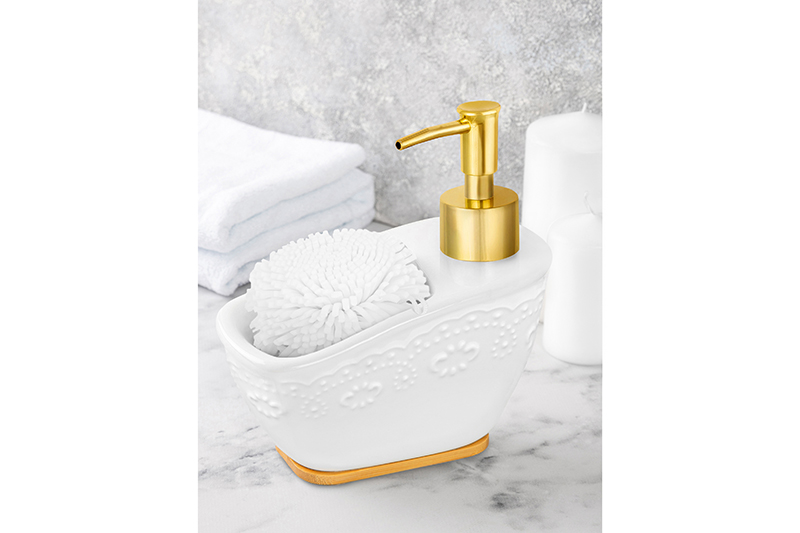 БЫЛО 810 руб! Диспенсер 15,5*8,5*15,5 см 500 мл "Белый узор" + губка на дер. подст.