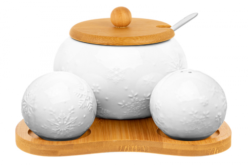 БЫЛО 973 руб! Набор - сахарница 440 мл 16*17*8,5 см "Снежинки" с ложкой + солонка+ перечница дер.подст