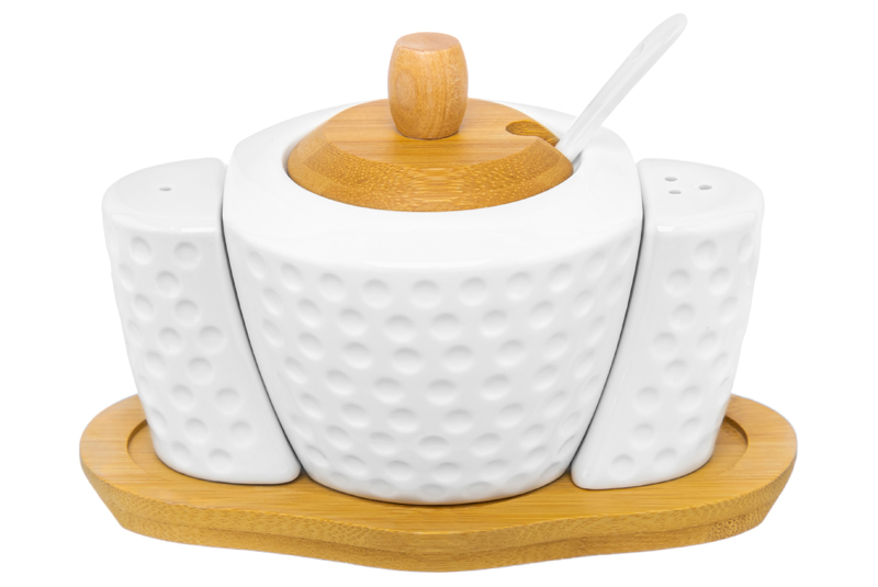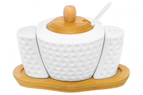 БЫЛО 747 руб! Набор - сахарница 300 мл 16*10*11 см "Сфера" с ложкой + солонка + перечница на дер. подставке
