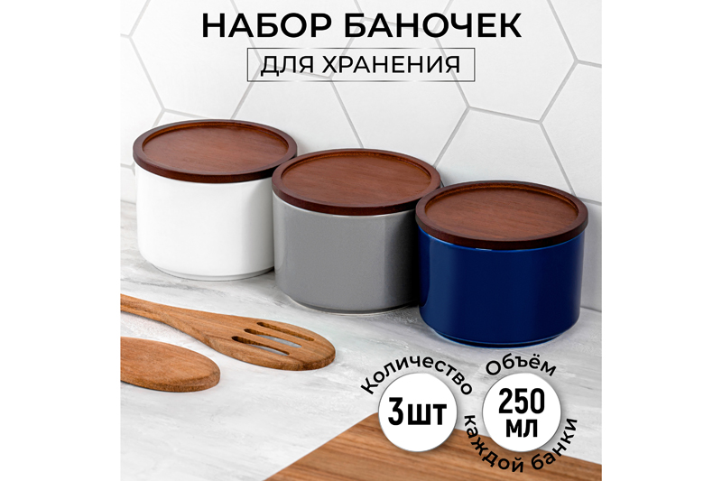 БЫЛО 974 руб! Набор 3 банок д/хранения 250 мл 9,3*9,3*7 см "Гладь"+дер.крыш-подст. с сил/упл (белая, серая, синяя)