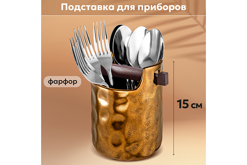 БЫЛО 1451 руб! Подставка для приборов 10,3*10,5*15,5 см 800 мл "Бронза" с деревянным разделителем