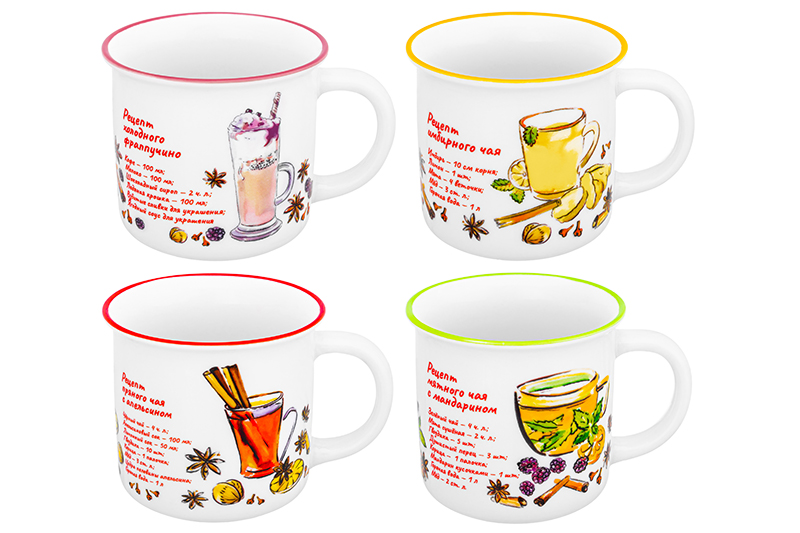БЫЛО 1176 руб! Набор 4 кружек 400 мл 13*9,5*8,8 см "Приятного чаепития-Рецепты напитков"(надпись на дне кажд.круж)