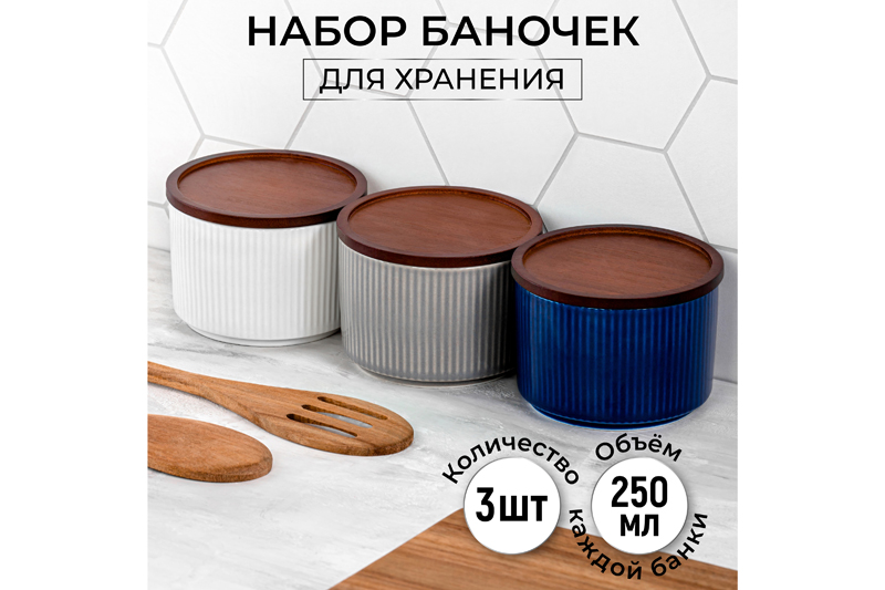 БЫЛО 974 руб! Набор 3 банок д/хранения 250 мл 9,3*9,3*7 см "Полоски" +дер.крыш-подст. с сил/упл. (белая, сер, син)