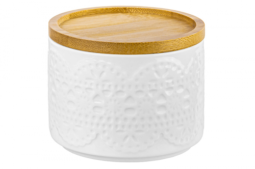 БЫЛО 276 руб! Банка д/хранения 250 мл 9,3*9,3*7 см "Кружево" + дер. крышка-подставка с сил. упл.
