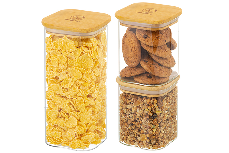 БЫЛО 1747 руб! Набор 3 банок д/хранен 2*800 мл 10*10*11,5 см+1,6 л 10*10*21,5 см "Crystal glass"+ бамб.кр с сил.пр