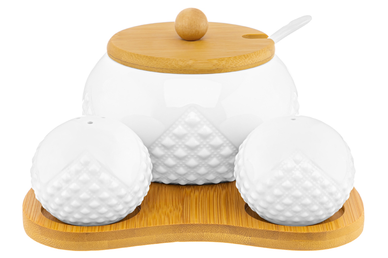 БЫЛО 1139 руб! Набор - сахарница 440 мл 16*17*8,5 см "Сфера" с ложкой + солонка + перечница на дер. подст.
