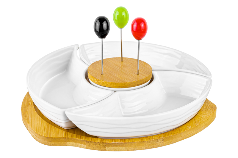 БЫЛО 1303 руб! Менажница 25*25*6 см "Айсберг волны" крутящ. 3 секции + 3 шпажки на дер. подст. + секц. д/хр. шпажек