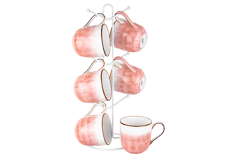 БЫЛО 4141 руб! Набор 6 кружек 360 мл "Кантри" коралловый, на металлической подставке 15*15*41,5 см