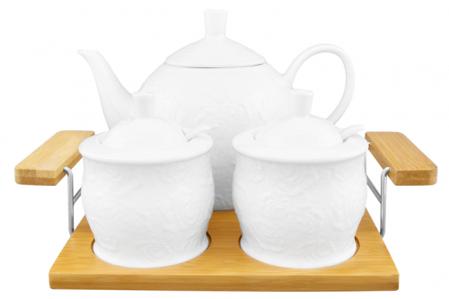 БЫЛО 2338 руб! Набор 30*25*17 см "Белые розы" чайник + сахарница + банка д/варенья + 2 ложки на дер. подносе
