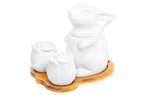 БЫЛО 1085 руб! Набор - сахарница 200 мл 15,5*11,5*13 см "Заяц с капустой" с ложкой + солонка+перечница на дер.подст