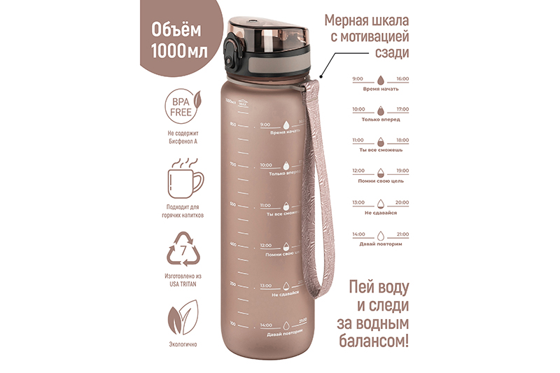 БЫЛО 1244 руб! Бутылка для воды 1000 мл 7,8*7,8*28,5 см "Style Matte" мотивационная капучино