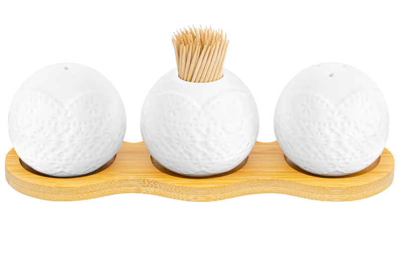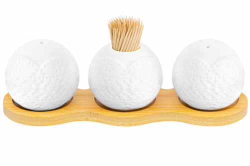 БЫЛО 563 руб! Вазочка под зубочистки + набор для специй 2 пр. 19,5*7*6 см 75 мл "Кружево" на деревянной подставке